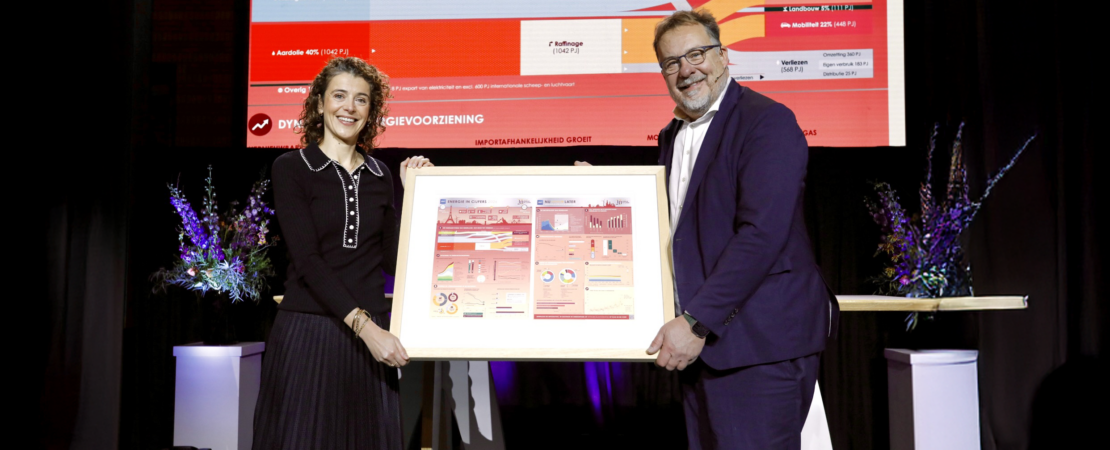 Tijdens het jaarlijkse EBN Energieontbijt met het thema ‘Later = Nu’ nam minister Sophie Hermans van Klimaat en Groene Groei het eerste exemplaar in ontvangst van de tiende editie van de infographic ‘Energie in cijfers’ uit handen van Jan Willem van Hoogstraten, CEO van EBN. De minister wees op de energie–importkloof uit de nieuwste infographic. “Het dichten van deze kloof vraagt om strategische keuzes. Voor onze economie en de veiligheid van ons land staat het buiten kijf dat we met de energietransitie moeten doorgaan.” Het Energieontbijt in het Kunstmuseum in Den Haag werd bijgewoond door circa 400 beleidsmakers en experts uit de top van de klimaat- en energiesector.